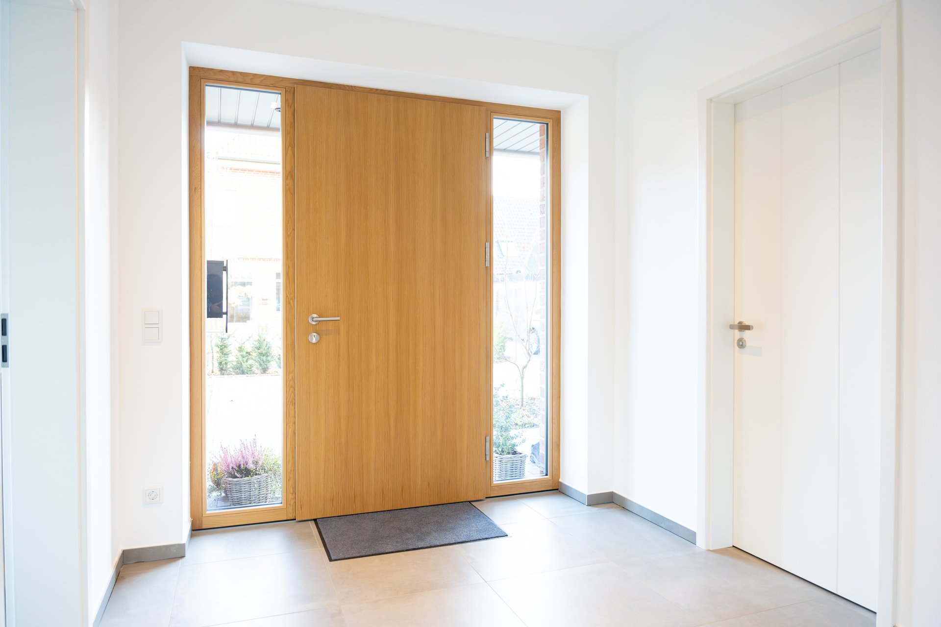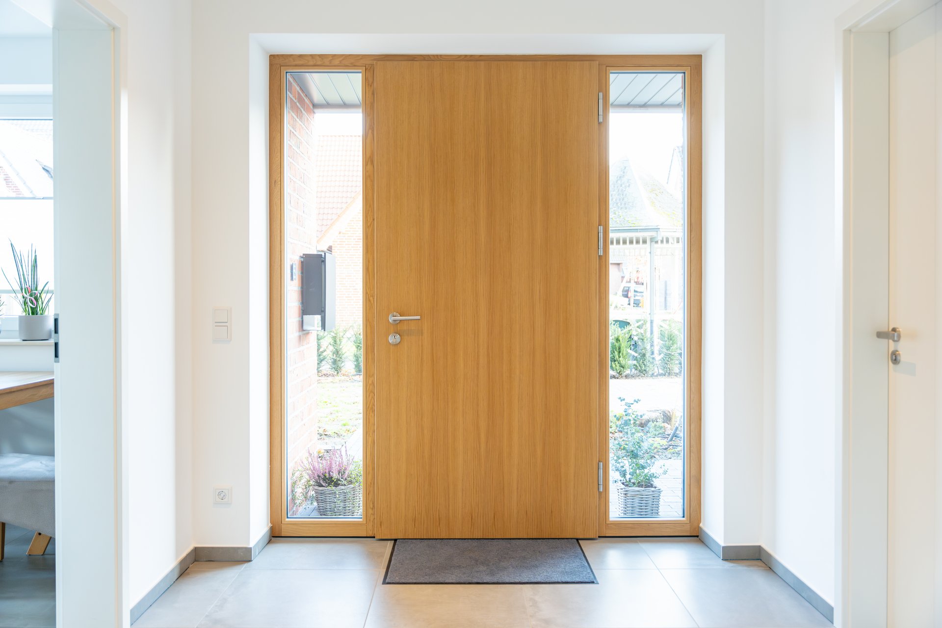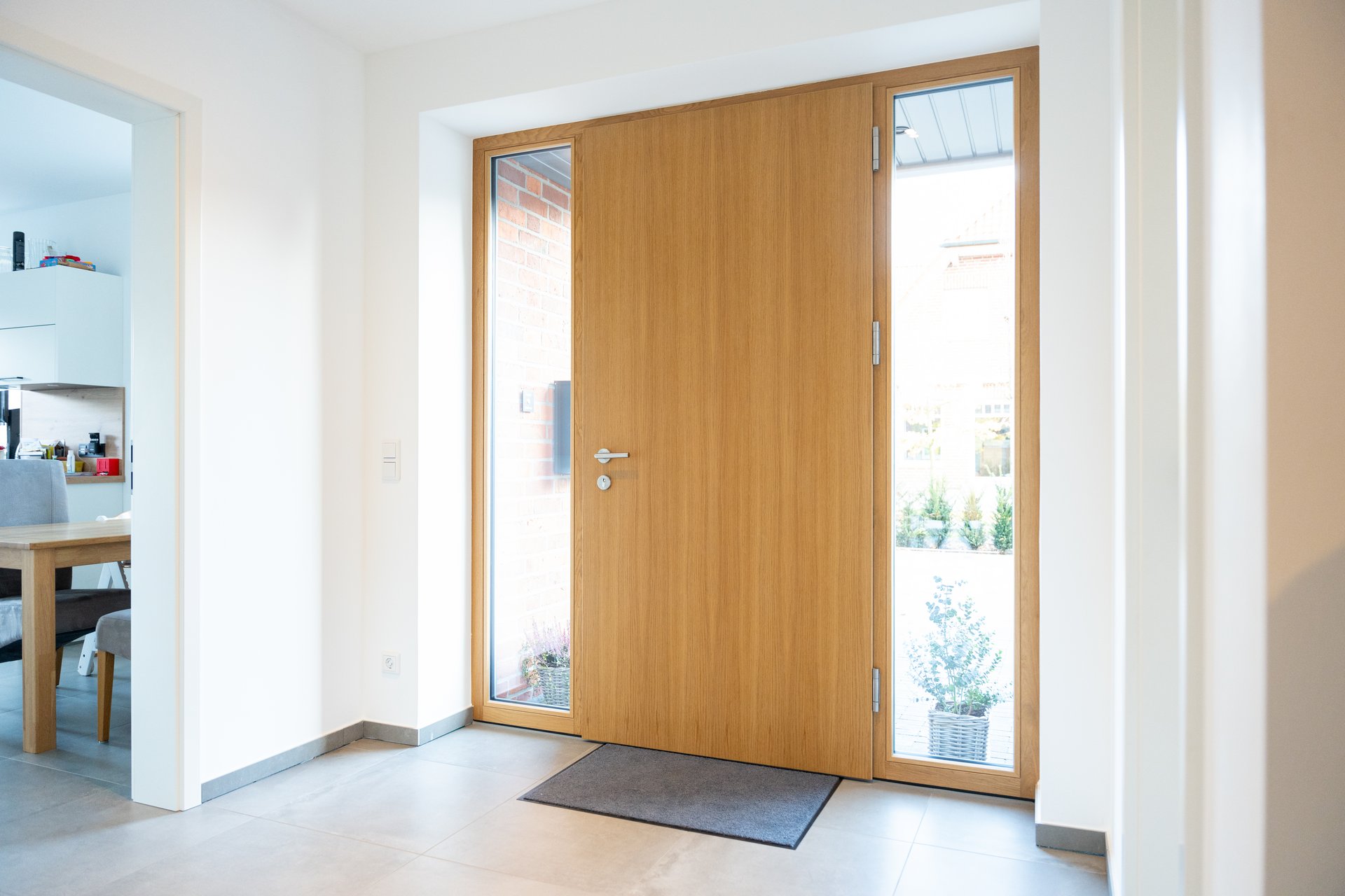 Holzhaustür aus Eiche mit zwei Seitenteilen und Automatikverriegelung
