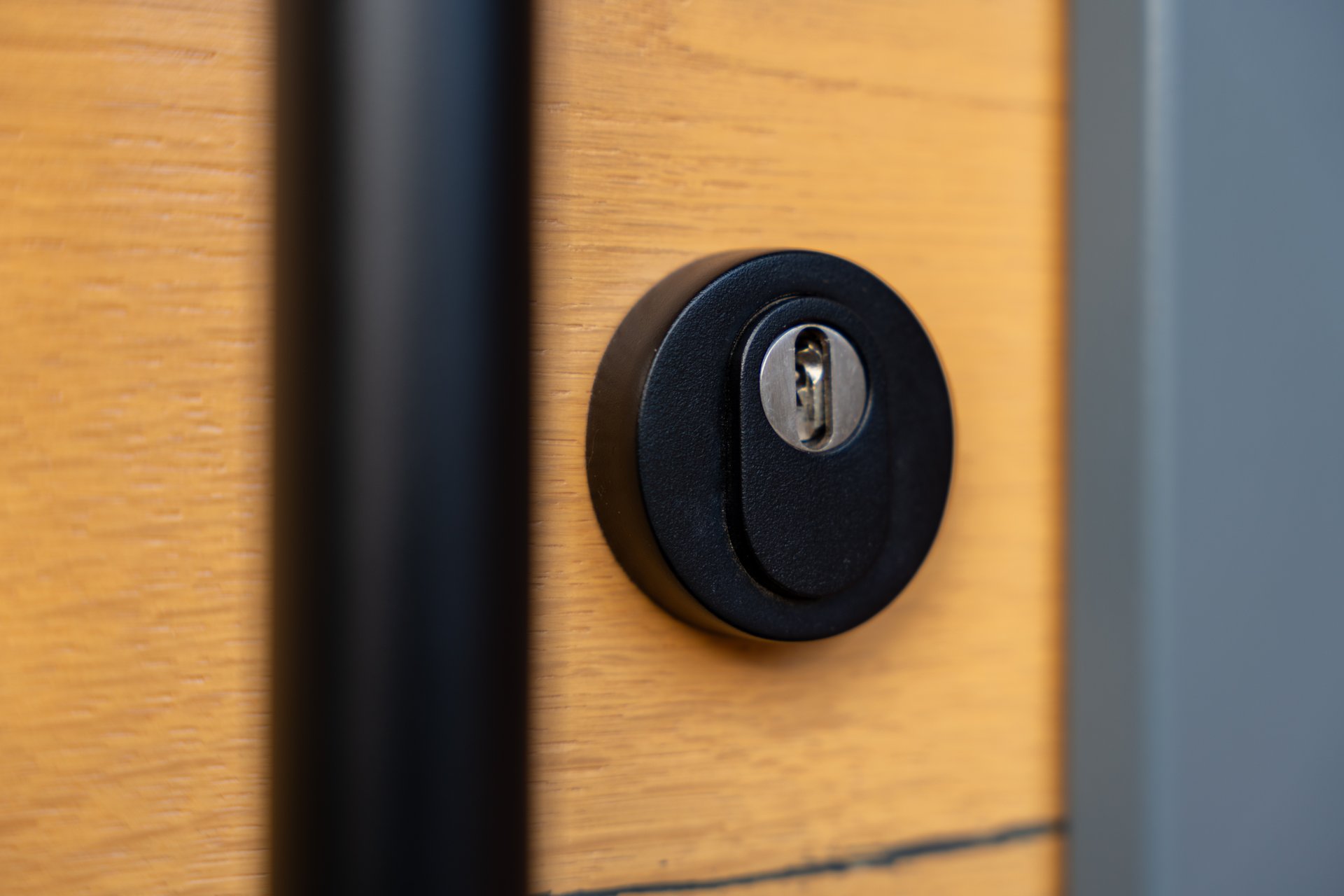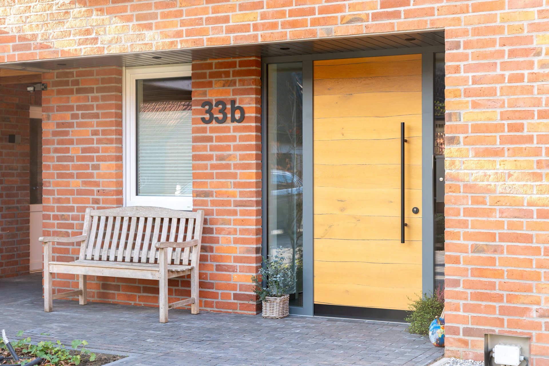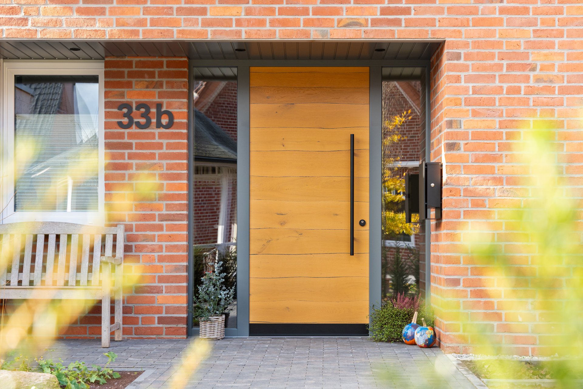 Holzhaustür aus Eiche mit zwei Seitenteilen und Automatikverriegelung