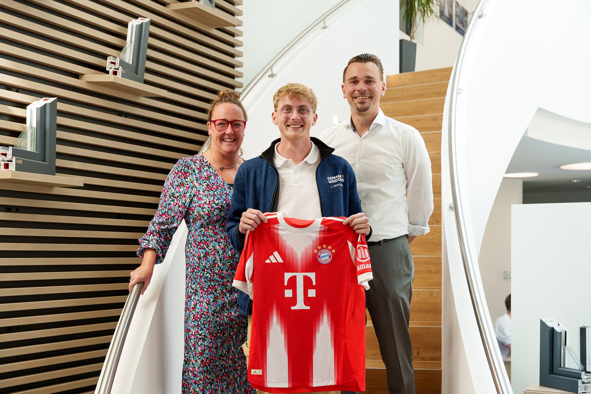 Unsere Ausbildungsleiterin Nicole Kempe und Marc Schiffer (Prokurist & Gesamtvertriebsleiter) gratulierten Jonah persönlich zu diesem besonderen Erfolg. Als Geschenk überreichten sie ihm das sogenannte "Authentic Heimtrikot" des FC Bayern München – seinem Lieblingsverein. Dabei handelt es sich nicht um ein gewöhnliches Fan-Trikot, sondern um ein Trikot in Profi-Qualität, das auch die Stars des Rekordmeisters auf dem Platz tragen.