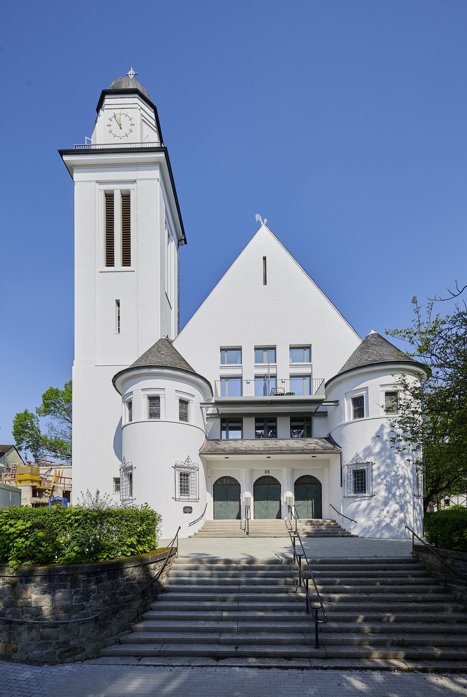 Fenster: 45 Aluminiumelemente (Kirche) sowie 90 Kunststoff- und vier Aluminiumelemente (Neubau) von German Windows