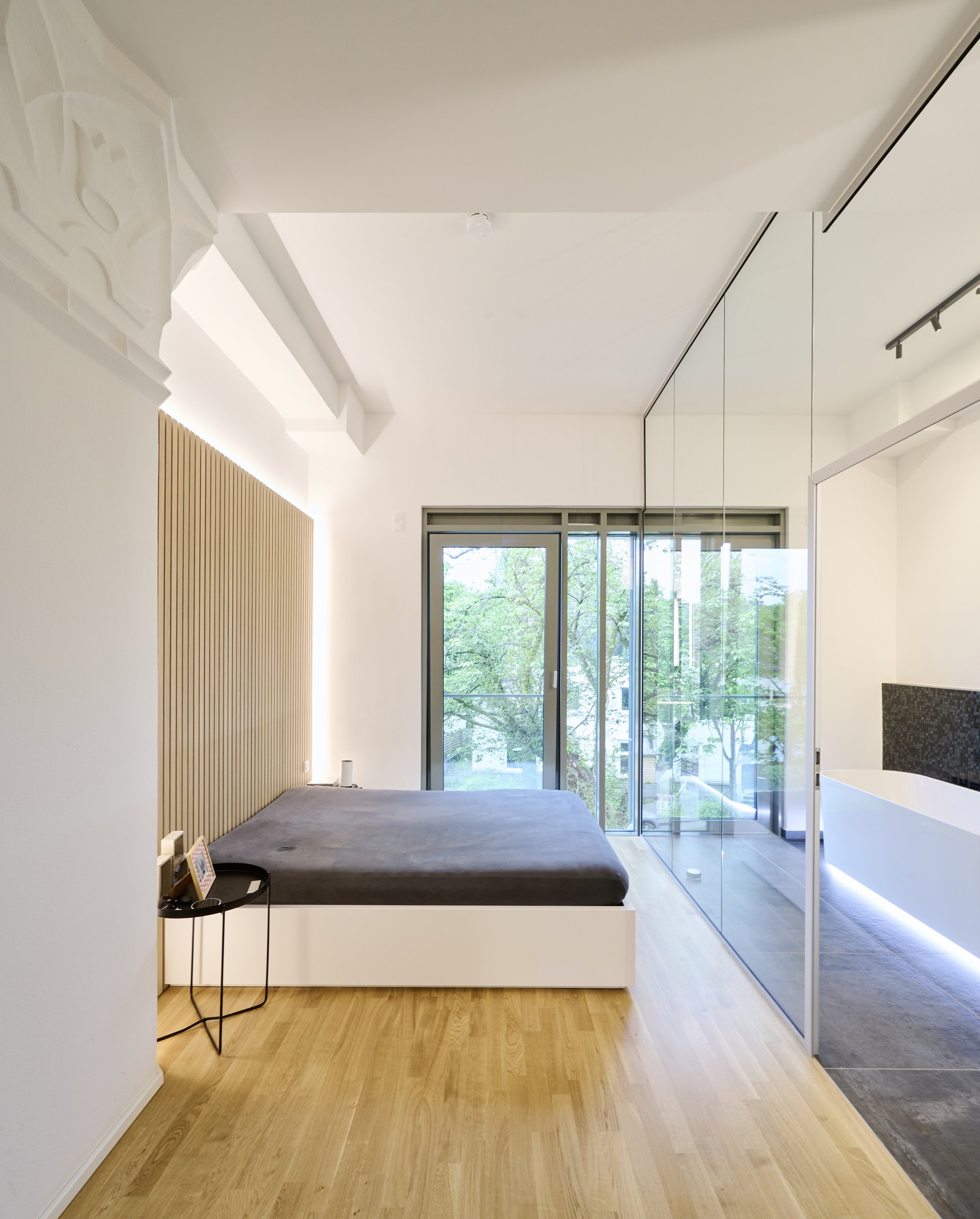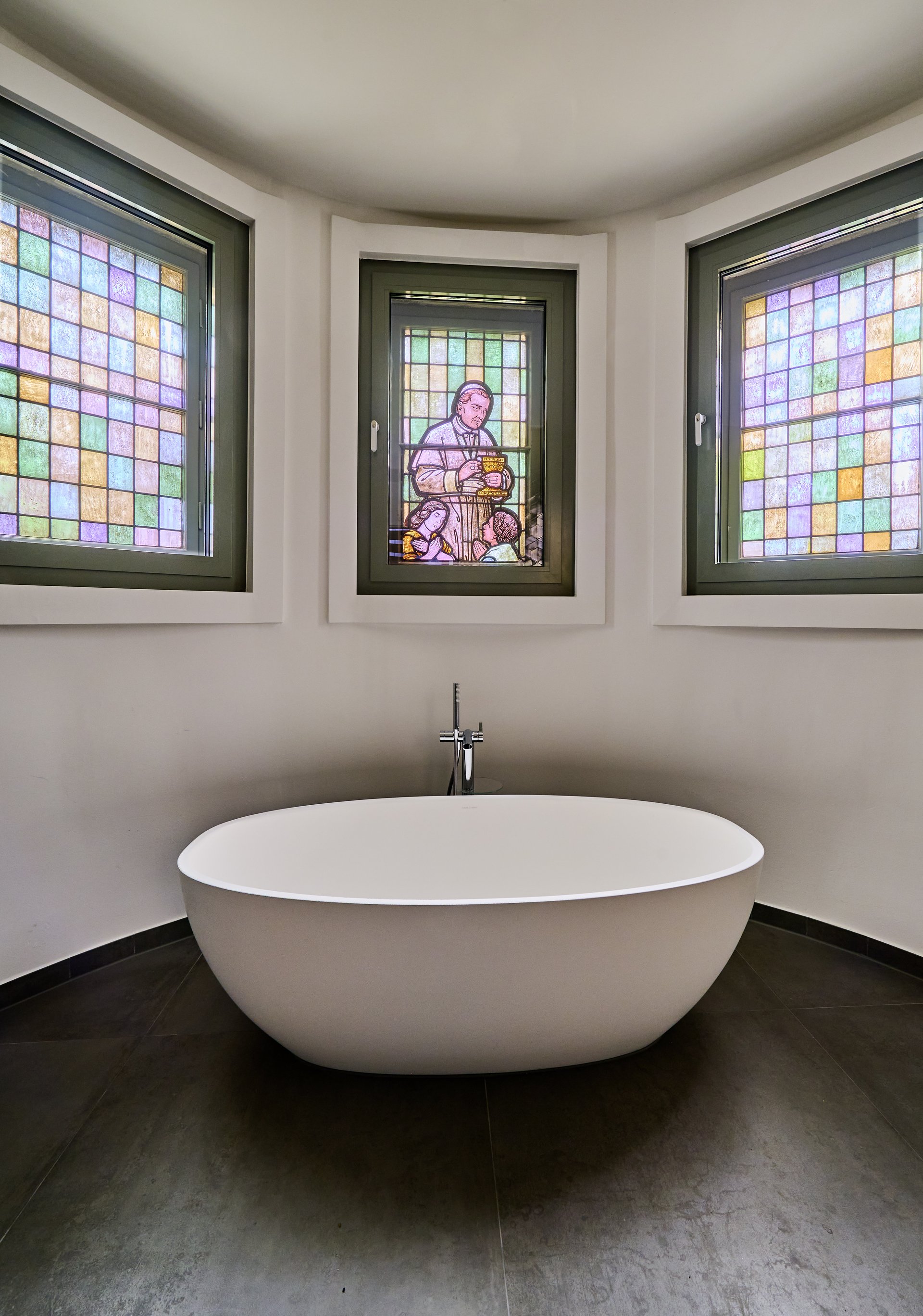 Die gewünschte lichtdurchflutete Gestaltung der Wohnungen erforderte großflächige Verglasungen. Die Lösung bestand – passend zum Stil der Kirche – im Einbau von vier Aluminium-Fensterelementen mit aufgekoppeltem Rundbogenfenster. Für helle Räume sorgen darüber hinaus zehn Pfosten-Riegel-Konstruktionen der Serie GW 2950 mit einflügeligen Dreh-Kipp-Fenstern (GW 2510), die als Einspannelemente in der Fassade verbaut sind. Im Bereich der Geschossdecken verfügen diese über spezielles Delogcolorglas: Das vollflächig farbig emallierte Einscheiben-Sicherheitsglas passt farblich zur Fassade und prägt als harmonisierendes Element den Charakter der Innenräume. Zudem verfügen die Konstruktionen über Ganzglas-Absturzsicherungen im Brüstungsbereich sowie ROMA-Textilscreens für einen effektiven Sonnenschutz.
