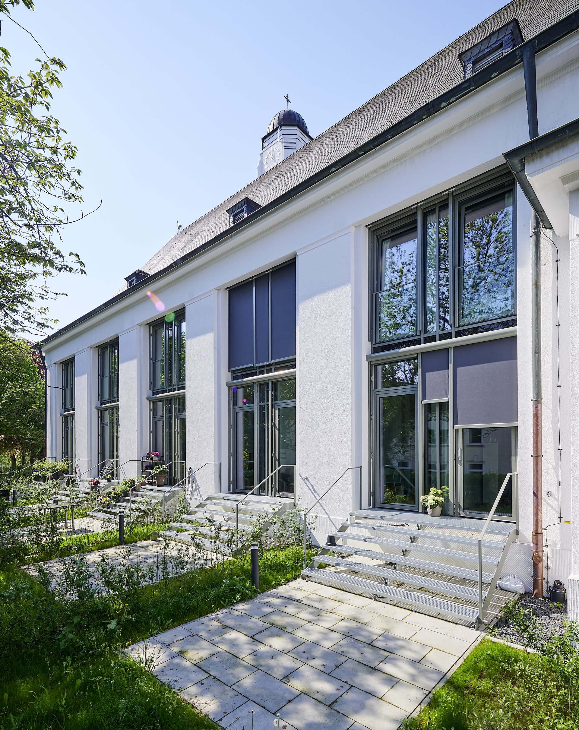 Im angrenzenden Neubau kamen derweil insgesamt 90 schiefergraue Kunststoff-Fenster und -Türen der Serie GW 510 zum Einsatz, die teilweise über eine absturzsichere TRAV Verglasung verfügen. Darüber hinaus wurden hier farblich passende Aluminiumelemente verbaut: Eine Eingangsanlage sowie drei einflügelige Rauchschutztüren mit Seitenteilen und Oberlichtern vervollständigen die Ausstattung.